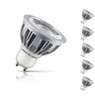 A value pack of 5 Cool White Crompton COB (chip on board) LED GU10 spotlight light bulb.